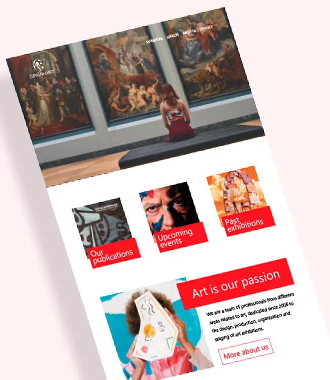We suggest the slogan “Art is our passion” to impact on the home page with a special section.